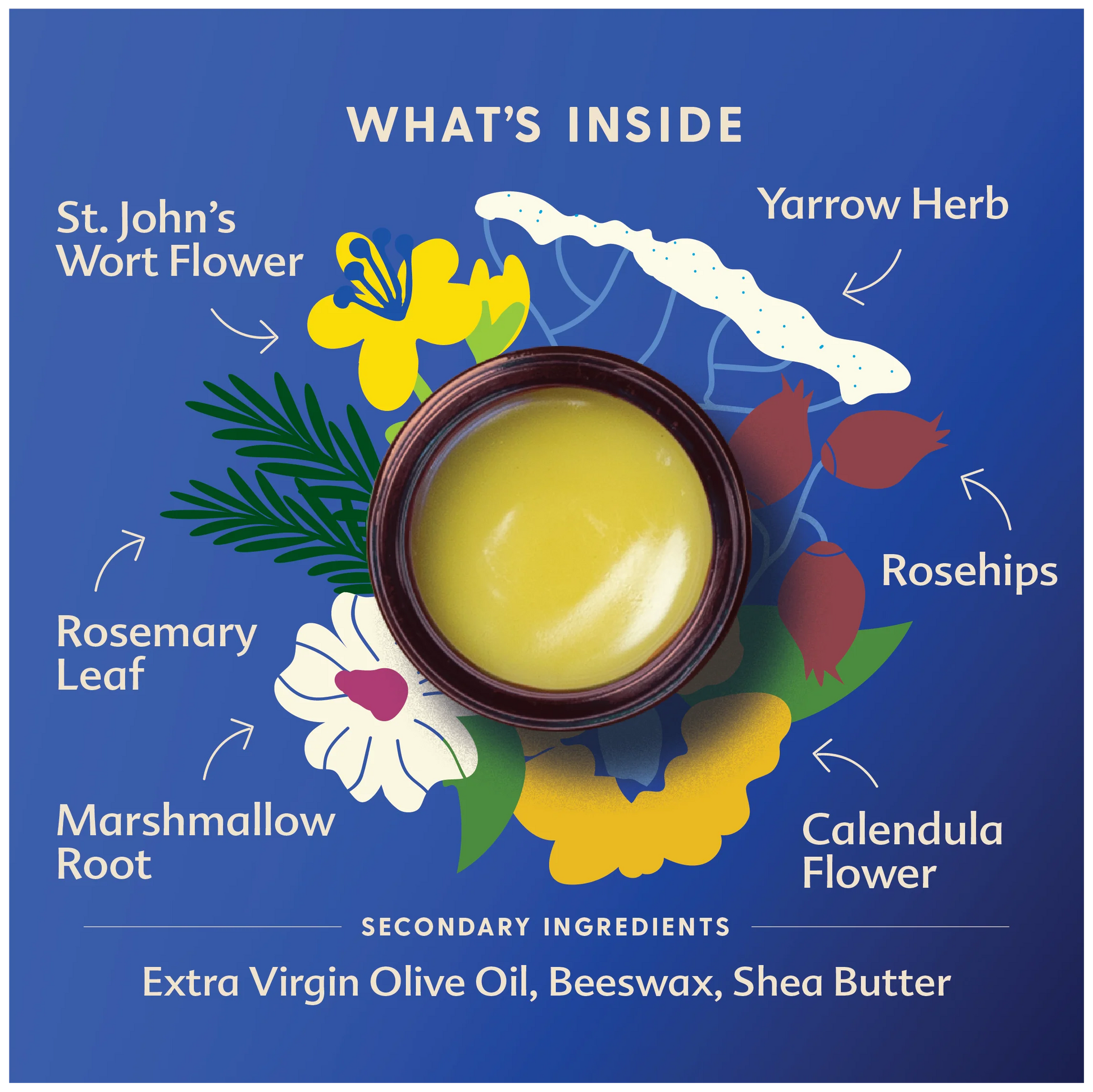 Extra virgin olive oil*, beeswax*, shea butter*, calendula flower*, marshmallow root*, rosehips*, St. John's wort flower*, yarrow herb*, rosemary leaf*