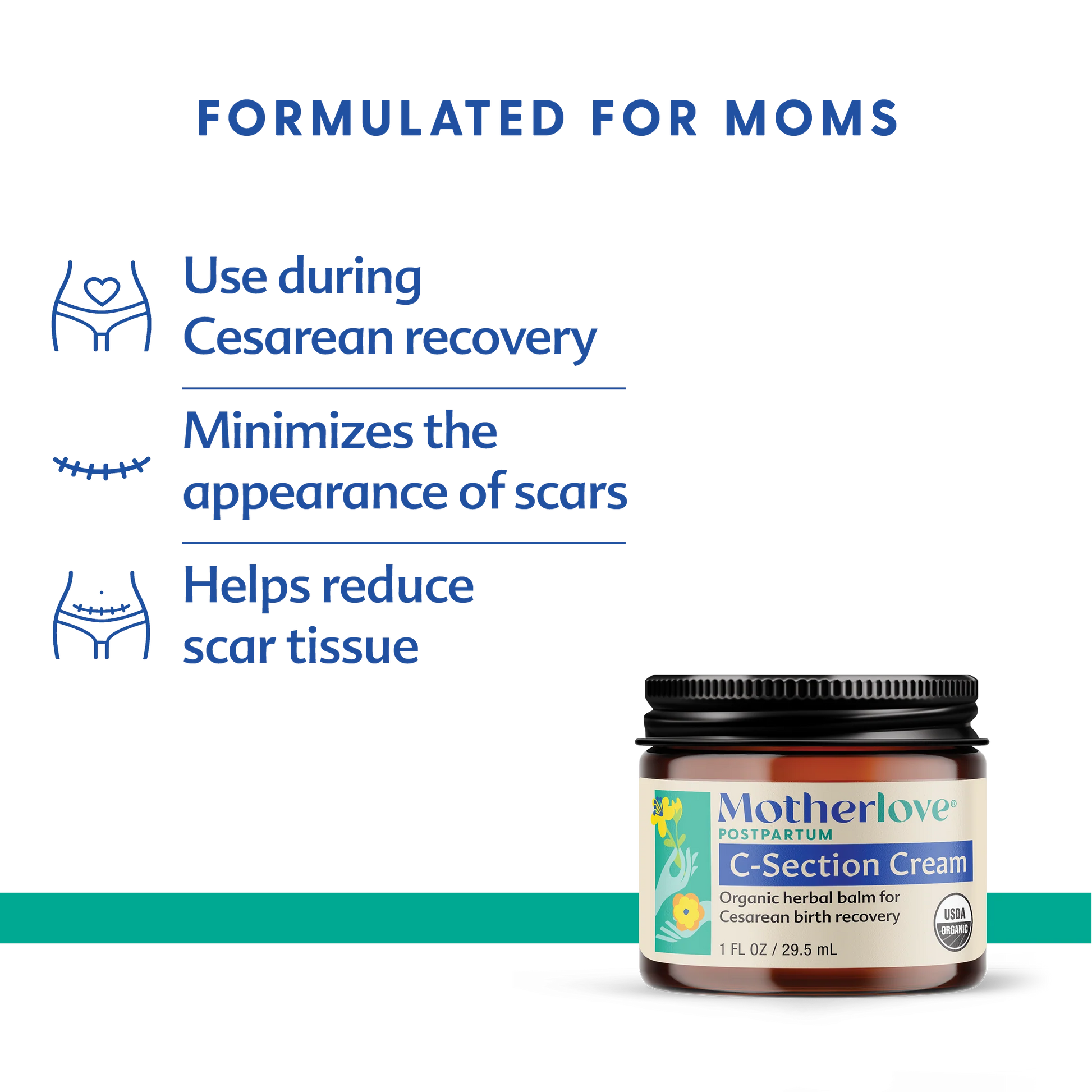 C-Section Cream is a postpartum essential after Cesarean birth. This organic scar cream helps soothe discomfort and promote recovery.